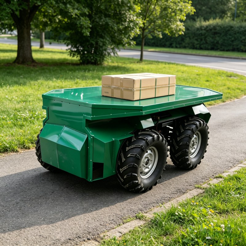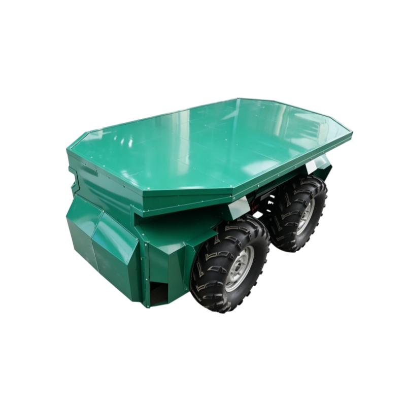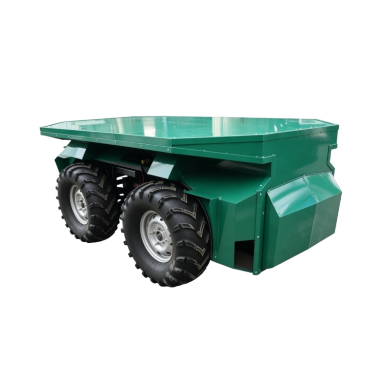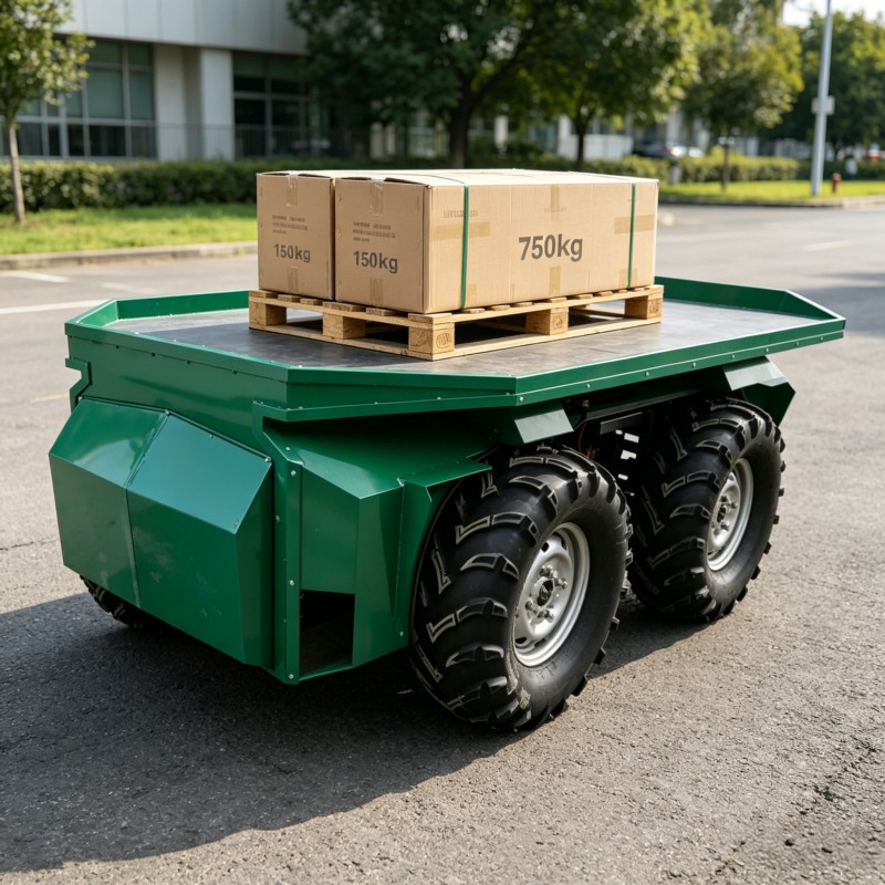4WD differential unmanned vehicle with 750kg payload, 45km range, 30° climb angle, and IP54 rating. Wireless remote control with CAN2.0. Ideal for military logistics and industrial cargo transport.